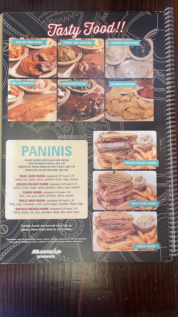 Start your day with dishes like french toast paired with eggs and bacon or sausage, or enjoy a savory skillet loaded with eggs, fresh veggies, and sausage for a satisfying morning meal. Later on, the menu invites you to savor plates such as pot roast, grilled grouper with green beans and cornbread, or a chili cheeseburger served with fries, all reflecting a down-to-earth, home-cooked vibe.